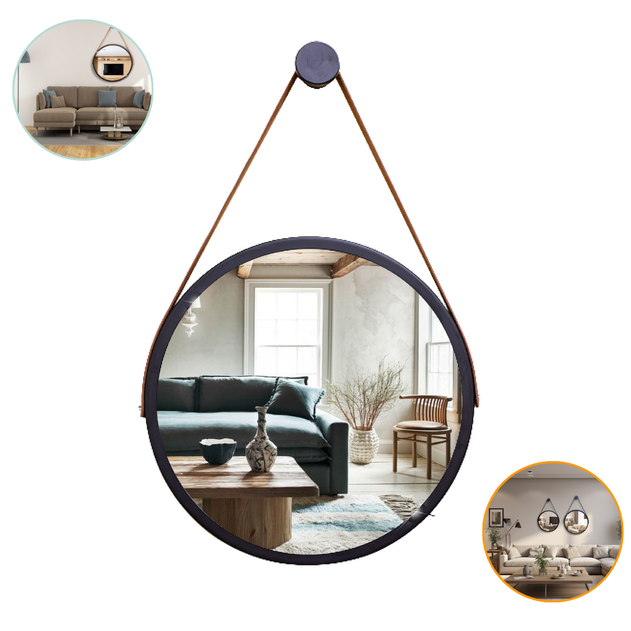 Espelho Adnet Luxo Decorativo Redondo 50cm Com Alça Caramelo E Moldura Preta